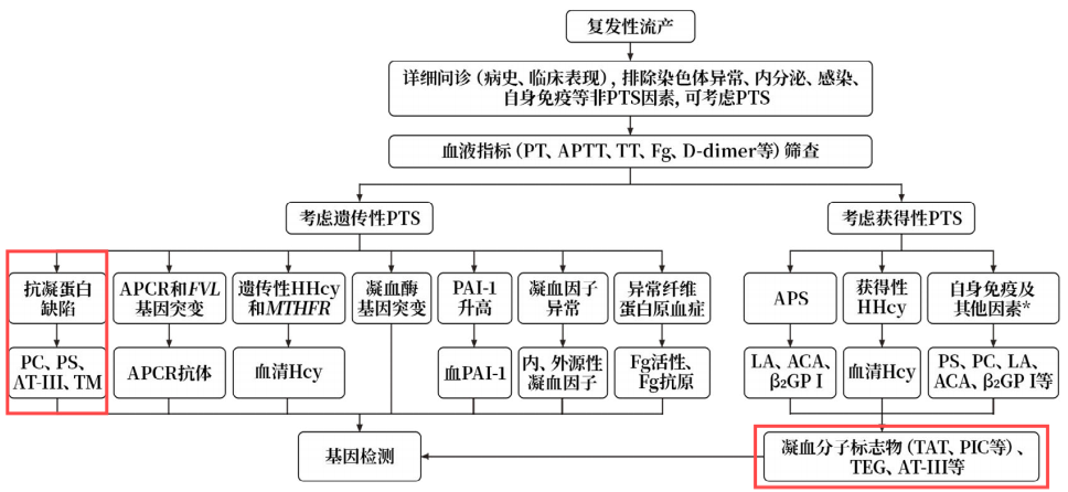 新血栓標(biāo)志物對(duì)PTS有重要提示意義,《復(fù)發(fā)性流產(chǎn)合并血栓前狀態(tài)診治中國專家共識(shí)(2021)》中指出對(duì)于RSA合并PTS患者進(jìn)行凝血功能的篩查,除PT、APTT等常用指標(biāo)外,有條件者可開展TAT、TM、PIC等分子標(biāo)志物,以評(píng)價(jià)患者體內(nèi)凝血功能及血管內(nèi)皮狀況,如圖1所示?!稄?fù)發(fā)性流產(chǎn)病因檢查專家共識(shí)(2022)》中建議有條件者可開展新血栓4項(xiàng)(TM、TAT、t-PAIC、PIC)檢測(cè)。