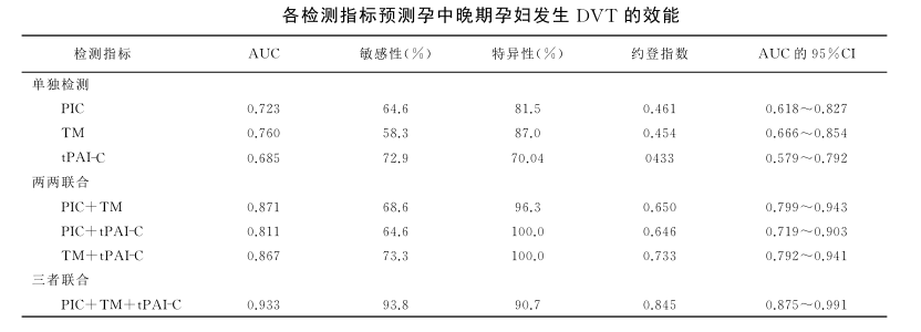 為了降低產(chǎn)前和產(chǎn)后出血的風(fēng)險(xiǎn),并在妊娠和分娩期間維持胎盤功能,生理高凝狀態(tài)伴隨著整個(gè)妊娠時(shí)間,然而過度的高凝狀態(tài)極易并發(fā)妊娠期VTE。沈劼等研究表明Caprini評(píng)分與靜脈血漿TM、TAT、t-PAIC、PIC水平對(duì)剖宮產(chǎn)術(shù)后DVT形成風(fēng)險(xiǎn)有較好的預(yù)測(cè)價(jià)值,提示臨床可根據(jù)新血栓四項(xiàng)水平早期采取措施預(yù)防術(shù)后DVT的發(fā)生。王宇等研究表明TM、TAT、t-PAIC、PIC為影響孕中晚DVT發(fā)生的獨(dú)立預(yù)測(cè)因子,新血栓四項(xiàng)聯(lián)合檢測(cè)對(duì)孕中晚期孕婦發(fā)生DVT的預(yù)測(cè)價(jià)值明顯優(yōu)于各單項(xiàng)指標(biāo)檢測(cè)或兩兩聯(lián)合(P<0.05),提示聯(lián)合檢測(cè)可為臨床早期診治提供參考,見下表。