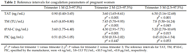 目前絕大多數(shù)實(shí)驗(yàn)室給出的凝血指標(biāo)參考范圍都是非孕期和普通人群,而妊娠期孕婦的血液是處于生理性的高凝狀態(tài),故孕婦不能參照非妊娠人群凝血指標(biāo)的參考區(qū)間,在將血栓四項(xiàng)指標(biāo)普遍用于妊娠期間與血栓性疾病的臨床評(píng)估之前,有必要為健康孕產(chǎn)婦建立參考區(qū)間。北京大學(xué)第三醫(yī)院張文靜等老師在《THE JOURNAL OF Obstetrics ancGynaecology Research》發(fā)表的學(xué)術(shù)論文對(duì)中國孕婦妊娠期TAT、TM、t-PAIC、PIC的變化及健康孕產(chǎn)婦妊娠期特定參考范圍進(jìn)行了研究。研究納入華北地區(qū)190例健康孕產(chǎn)婦,采用化學(xué)發(fā)光法檢測(cè)TAT、TM、t-PAIC和PIC水平,在2.5%和97.5%的分布范圍建立了妊娠期特定參考區(qū)間(結(jié)果見表2)。最終研究表明,TAT、TM、t-PAIC的水平從孕早期(妊娠5-12周)到孕晚期(妊娠28-40周)顯著增加,而PIC的水平并沒有隨著孕周的增加而發(fā)生顯著變化。
